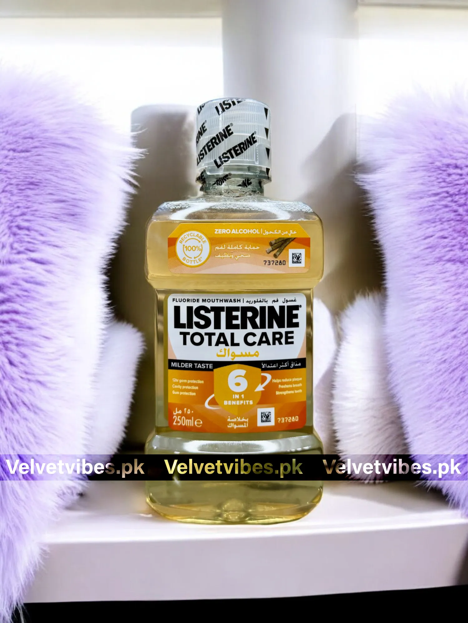 A fluoride mouthwash that provides 6-in-1 benefits for gum protection and a milder taste. Gum protection & Miswak formula for healthy gums, 6-in-1 benefits: kills germs, freshens breath, prevents gingivitis, Zero alcohol formula.